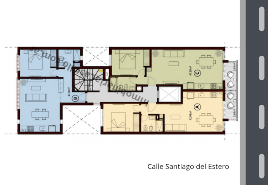 El emprendimiento cuenta con 9 plantas de 3 departamentos de dos ambientes por piso, compuesto por: dos al frente con balcón y uno al contrafrente con balcón francés.
