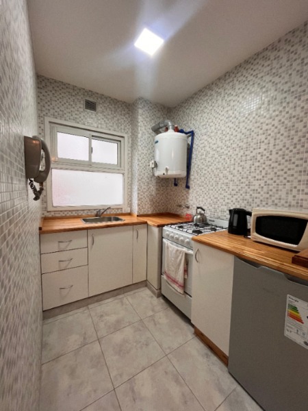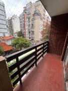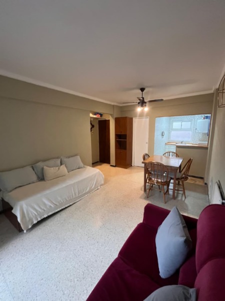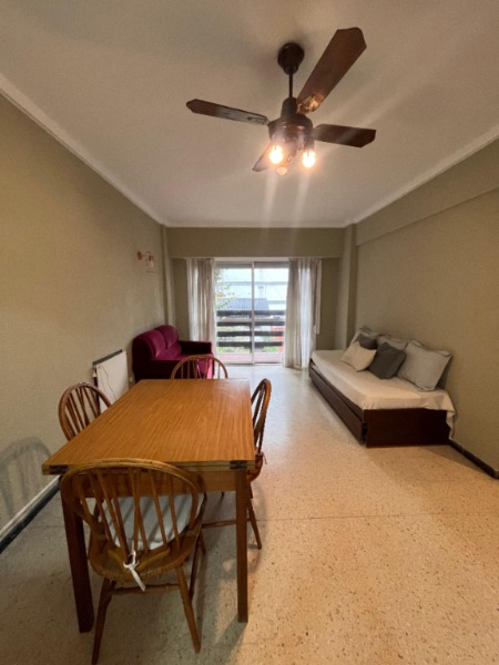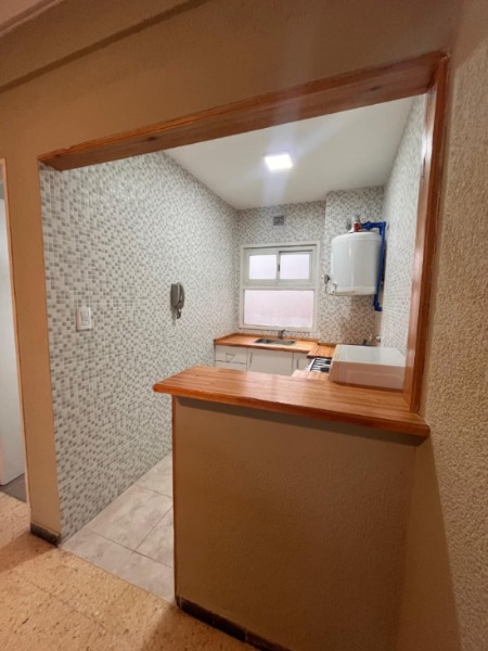 Living-comedor con cocina integrada, baño completo, balcón saliente.