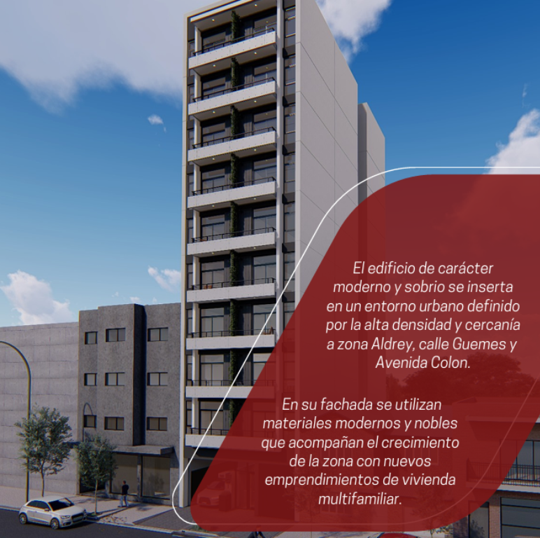 Distribuído en 9 plantas de 3 departamentos de dos ambientes por piso, compuesto por: dos al frente con balcón y uno al contrafrente con balcón francés.