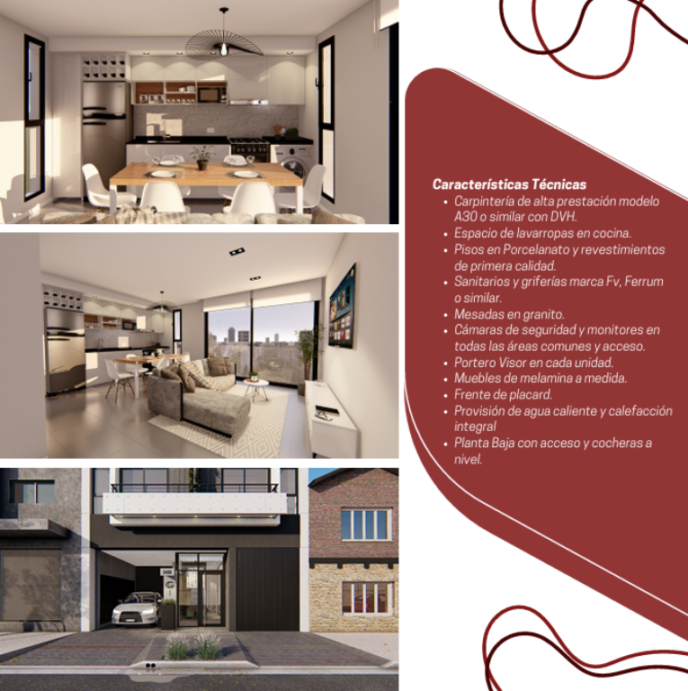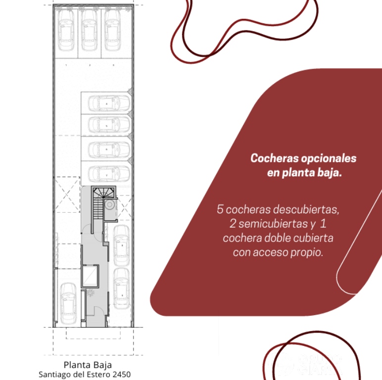 Cocheras opcionales en planta baja, 5 descubiertas, 2 semicubiertas y 1 cochera doble cubierta con acceso propio.