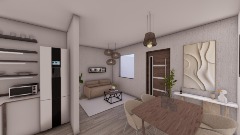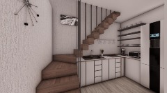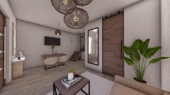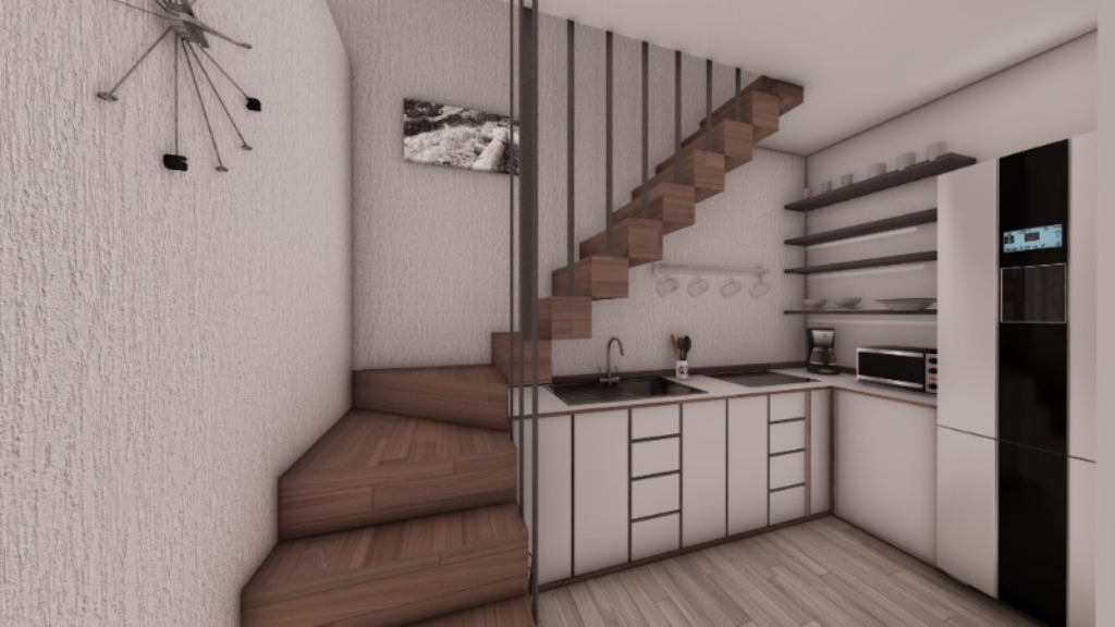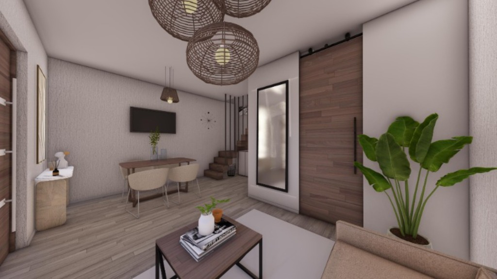 Primer planta: Living-comedor con cocina integrada al frente con terraza propia, toilette.